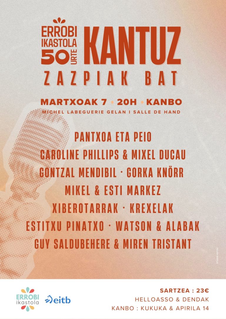 - 20h00 : Pantxoa eta Peio – Caroline Phillips & Mixel Ducau – Gontzal Mendibil · Gorka Knörr – Mikel & Esti Markez – Xiberotarrak · Krexelak – Estitxu Pinatxo · Watson & Alabak – Guy Saldubehere & Miren Tristant