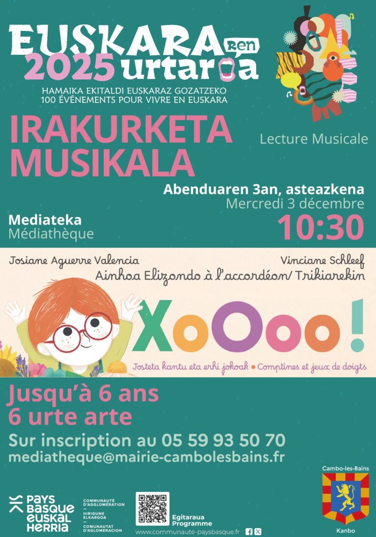 Un moment tendre et rythmé pour éveiller les plus jeunes aux sonorités de l’euskara à travers le chant et le jeu.