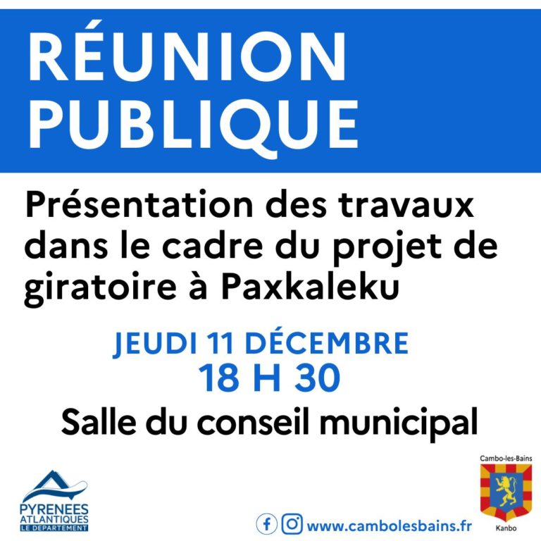 Présentation des travaux dans le cadre du projet de giratoire à Paxkaleku. Jeudi 11 décembre à 18h30 à la Mairie, salle du conseil municipal. Partager :Cliquez pour partager sur Twitter(ouvre dans une nouvelle fenêtre)Cliquez pour partager sur Facebook(ouvre dans une nouvelle fenêtre)Cliquer pour imprimer(ouvre dans une nouvelle fenêtre)